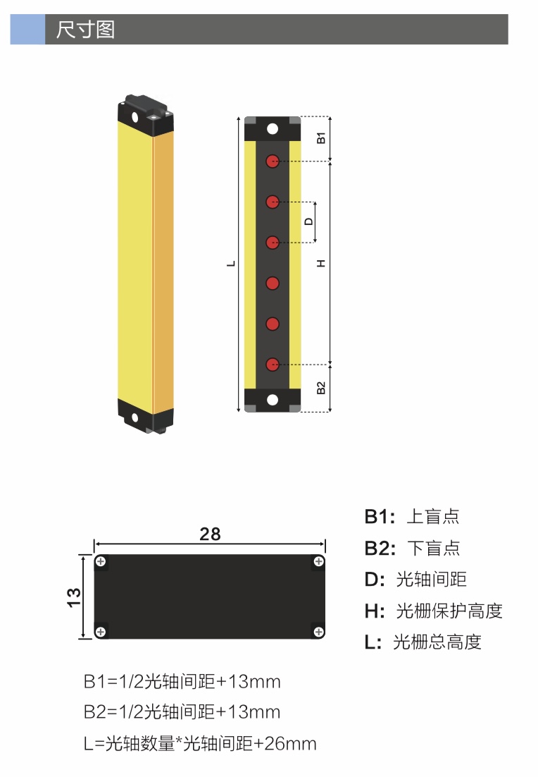 3.该光栅厚度为13mm,应用小空间、紧贴安装或需要隐秘等设备,可应用于AOL等光学检测设备作防护或启动信号使用。